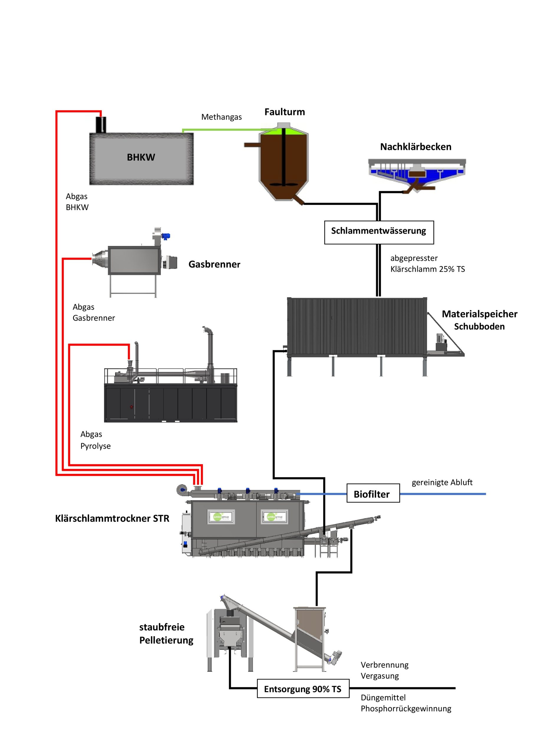 Krankheitserreger, welche im Klärschlamm über Viren, Bakterien, Endotoxine, Pilze, Einzeller und Würmer vorhanden sind, werden über die Trocknung vollständig vernichtet.